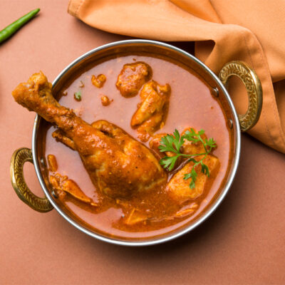 Punjabi-style chicken pieces with tomatoes, fresh ginger, coriander and spices.
