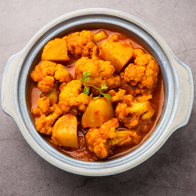 Potatoes and cauliflower cooked with cumin and onion in a tomato and ginger spice mix.
