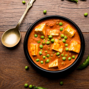 Homemade Indian cream cheese in an onion-tomato sauce, with green peas, Indian spices and herbs / Fresh homemade cheese and green peas cooked in an onion-tomato gravy.