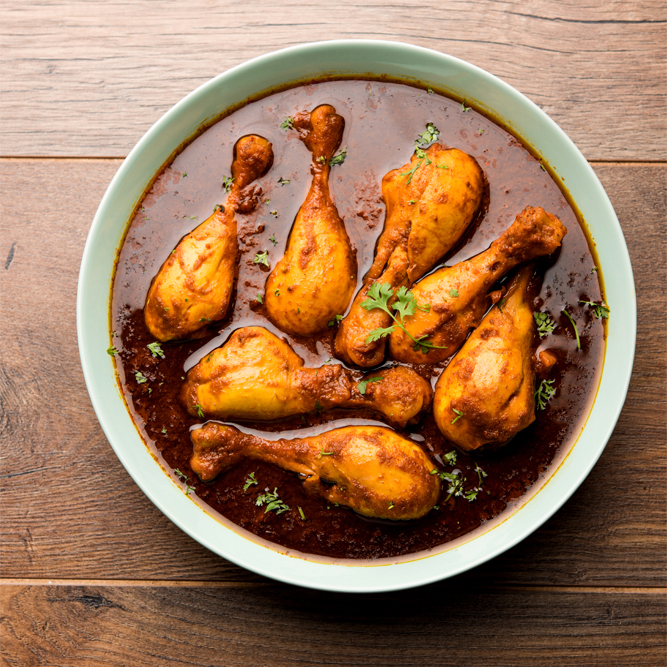 Punjabi-style chicken pieces with tomatoes, fresh ginger, coriander and spices.