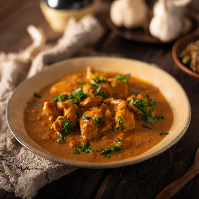 Punjabi-style chicken pieces with tomatoes, fresh ginger, coriander and spices.