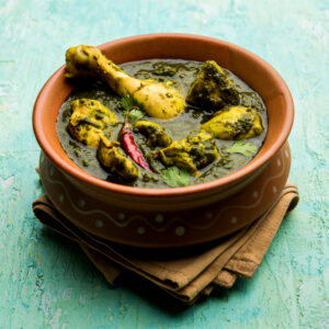 Juicy pieces of chicken cooked in mildly seasoned spinach with ginger, garlic and spices.