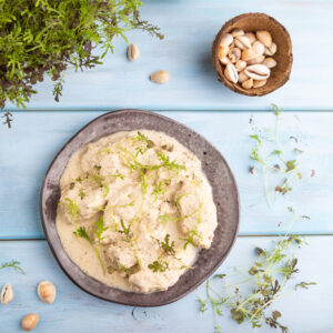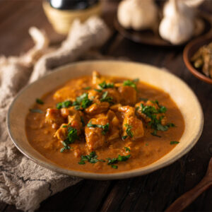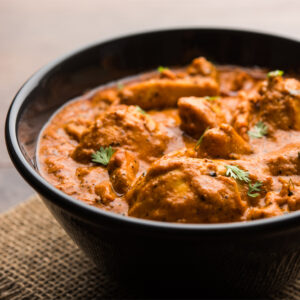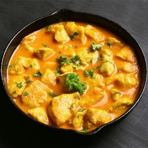 Chicken prepared in a mild cream sauce with ground cashew nuts and coconut milk.