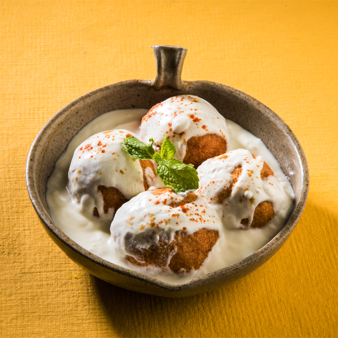 Fried lentil flour balls in a spicy yoghurt sauce with chutneys/ Rice donut soaked in masala yoghurt with chutneys.