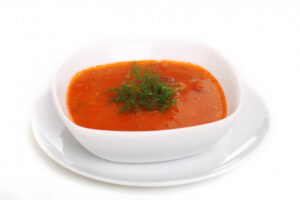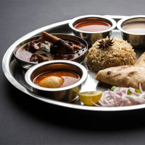 Plate with various specialties: dal (lentils), chicken curry and sabzi (vegetables), with basmati rice, raita (yoghurt), papadam and mixed pickles.