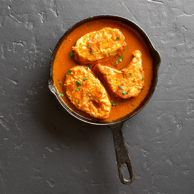 Fish cooked in a fine tomato, onion, garlic, ginger curry sauce, cumin with coconut.
