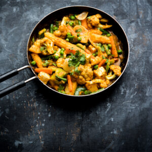 Potatoes and cauliflower cooked with cumin and onion in a tomato and ginger spice mix.
