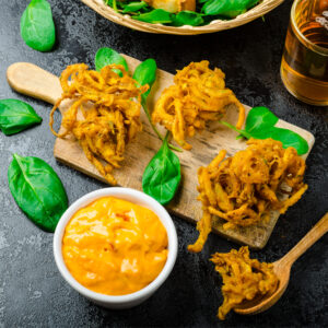 A highly popular indian starter made with sliced onions, flavored with spiceslentil flour and fried crispy to perfection. Served with assorted chutneys.