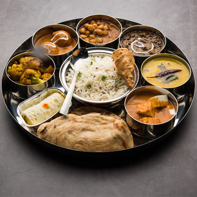 Vegetarian platter with various specialties: dal (lentils), palak paneer and sabzi (vegetables), with basmati rice, raita (yoghurt), papadam and mixed pickles.